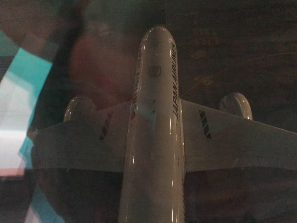 行ってみたら深夜なので運航便が少なく「Sky Bridge」の下を通る飛行機がない。諦めて戻ろうかと思ったらJAL便がボーディングブリッジから切り離されて、バックで橋の下に入ったので真上から飛行機が見れた。周りが暗いので写真写りは良くないです