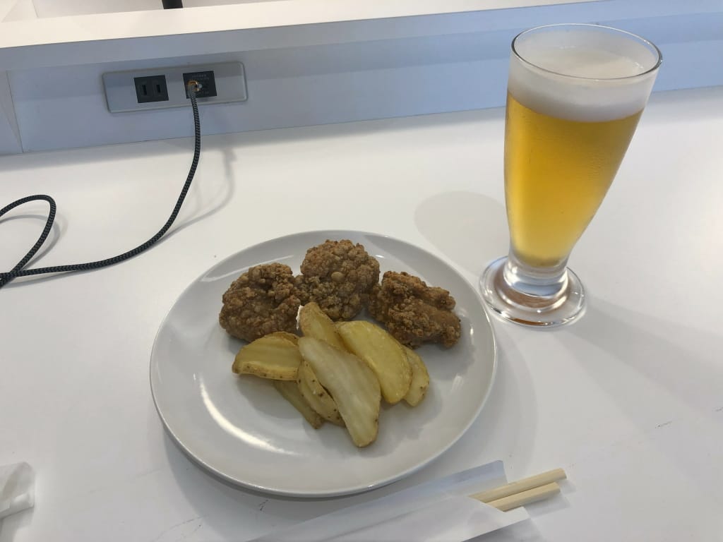 ビールとおつまみとしてザンキとポテトを持ってくる。このほかお約束のJALカレーを頂きました。昨年は取り分けて頂きましたが、今回はコロナ前のビュッフェ形式に戻っていました。奥のダイニングエリアには料理やビールがおいていなかった記憶でしたが、今は一部の料理(たぶん、人気なもの)とビールサーバーが置いてあります。お腹が膨れたらさっさと1Fに降りてくつろぐのが基本です
