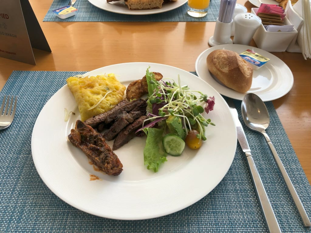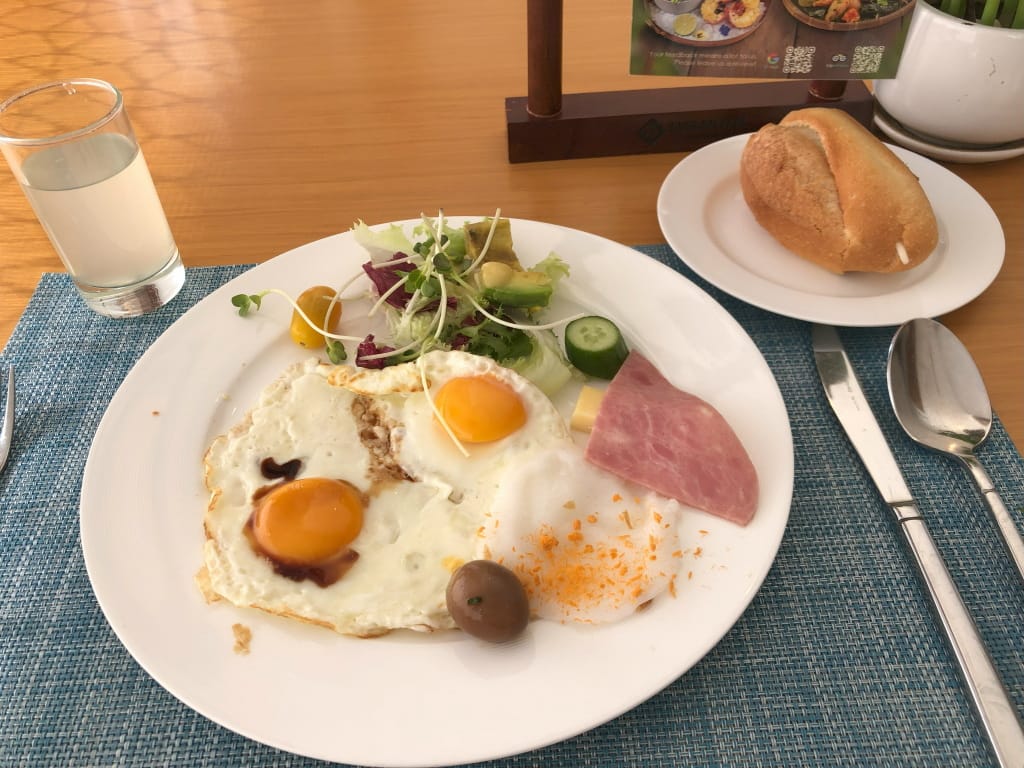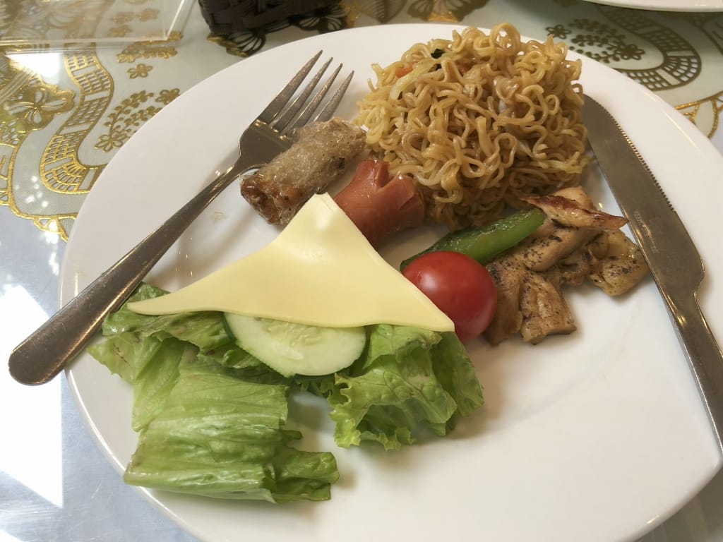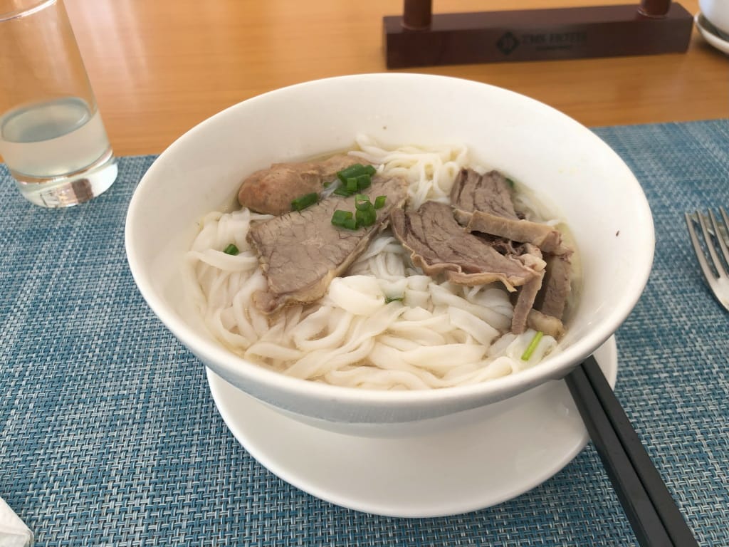 翌日、朝食を取りに行く(確か2階)。ビュッフェの料理数は少ないほうだと思う。テーブルにメニューがおいてあって(置いていないテーブルもあった)、卵料理とフォーがオーダーできます。ウエイトレスの1人に話しかけて、今回フォーをお願いしました(話しかけられることはなかった)