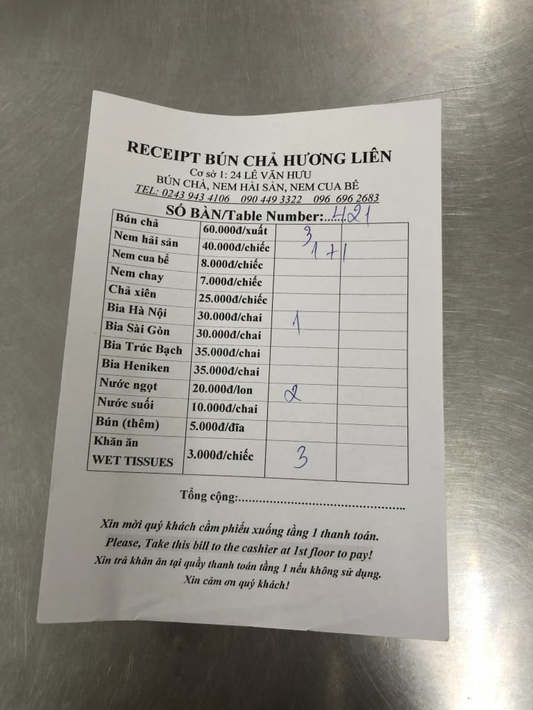 着席してメニューを見ていると、自動的にブン(麺)と有料おしぼり(3Kドン/18円)はやってくる。メニューはシンプルに構成されていますがコンボメニュー(COMBO OBAMA)ありです。「ブンチャセット」と「揚げ春巻き」と「缶ビール」のコンボでが130Kドン(780円)でした(単品単価を単純に足しただけ)。昨年は120Kドンだったので値上げしていた。60円くらいの差ですけども