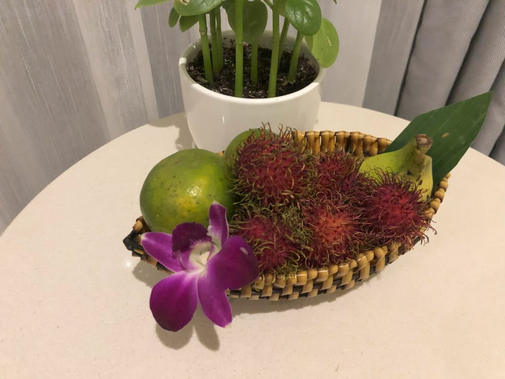 - ウェルカムフルーツがおいてありました。バナナがまだ青かったので成熟を待っていたら2日目のルームクリーニングで全回収されました(´;ω;`)ウゥゥ