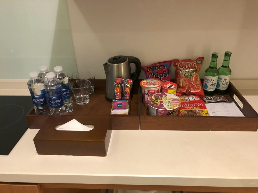 ホテル側から事前に到着予定時間の共有をお願いされていたので23:00辺りと伝えていたところ、ちょうど23:00到着で驚いた。チェックインでパスパートを渡して飲み物を頂き、飲んでいる間にチェックイン手続きをされ、カードキーを1枚渡されて完了(クレジットカードは不要だった)