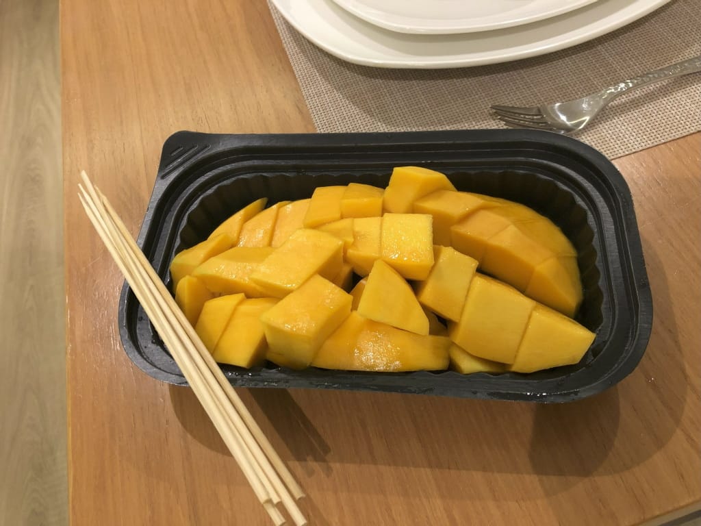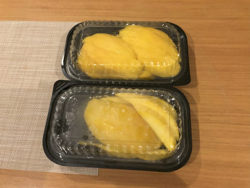 HELLOでマンゴースライスをお願いすると70Kドン(420円)/Kgです。大き目マンゴー2個で1㎏くらいです。マンゴーは自分で選びます。甘いのがお好きなら出来るだけ濃い黄色のものを選びましょう。その左隣のお店のマンゴー単価は覚えていませんが、HELLOよりちょっと安かったかもです。こちらはお店の人がマンゴーを選びます。どちらのお店も熟しが足りないと思いました。ホテルの部屋に冷蔵庫があって、その中に1日置いたら熟しておいしくなりました