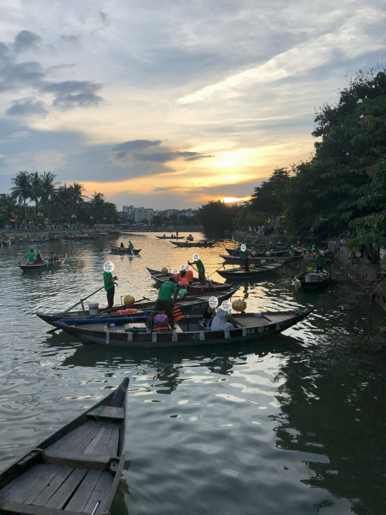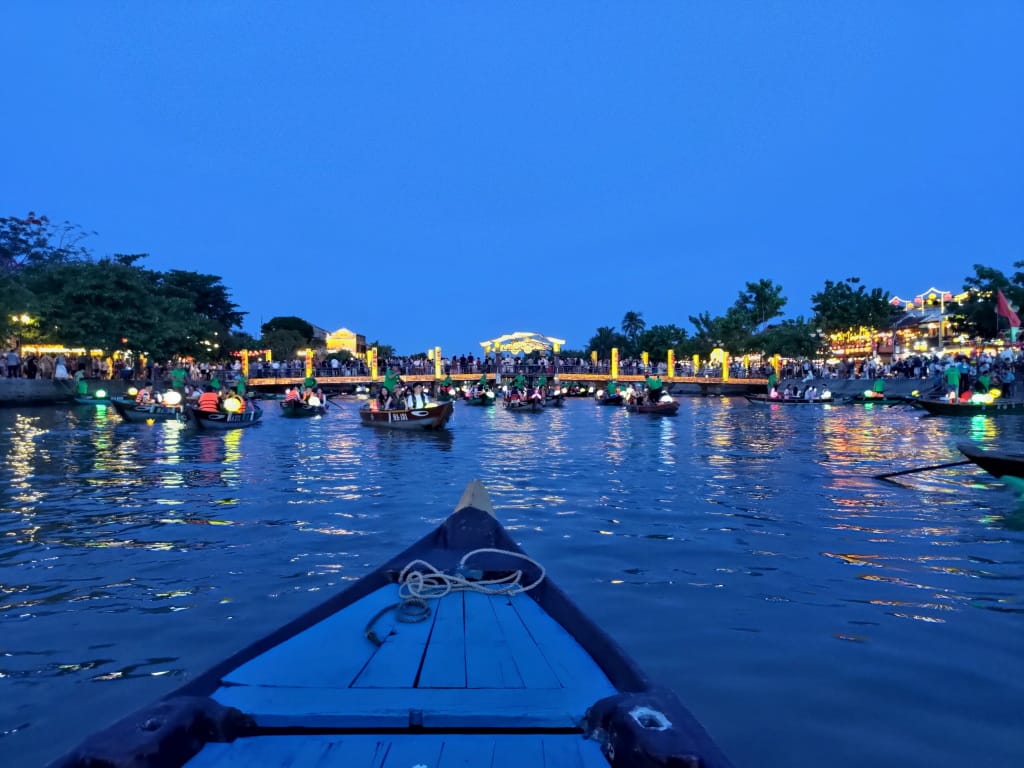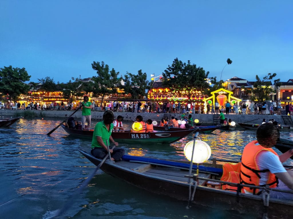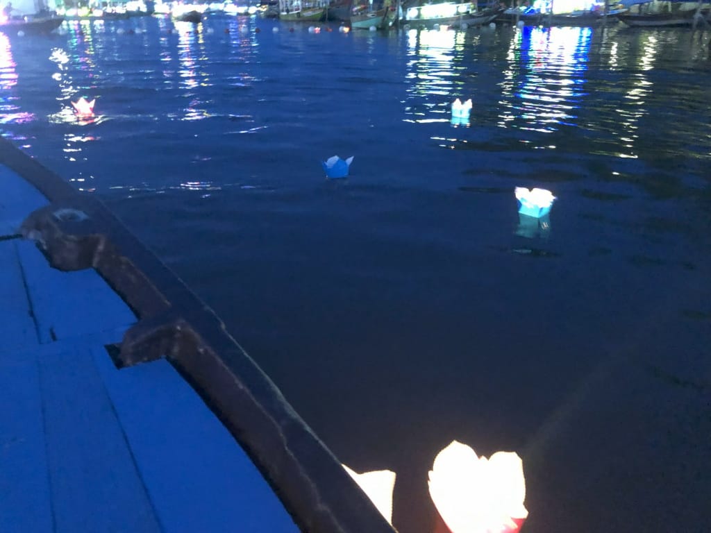 ボート乗り場(階段)は複数あって、列の先頭であっちの乗り場、こっちの乗り場と指示されます。指示通りの乗り場前に移動して待っているんだけどなかなかボートが来ない。真っ暗になる前にボートに乗ると、川は手漕ぎボートで埋め尽くされており時折他のボートに軽く接触。周回ルートは決まっているようで、同じ方向に流れて進んでいく感じ。乗っている最中は手漕ぎボートのランタンと町のランタンの光がきれいでした。川からの異臭はありません。船頭さんが写真を撮るというジェスチャーをされるのでスマホを渡して記念撮影してもらえます。購入した灯篭は船頭さんに火をつけてもらって、各自流していきます。あまり流している人はいないようで「灯篭の光がきれい」とはなりませんでした。乗っていた時間は測りませんでしたけども、公称通り20分程度だったと思います