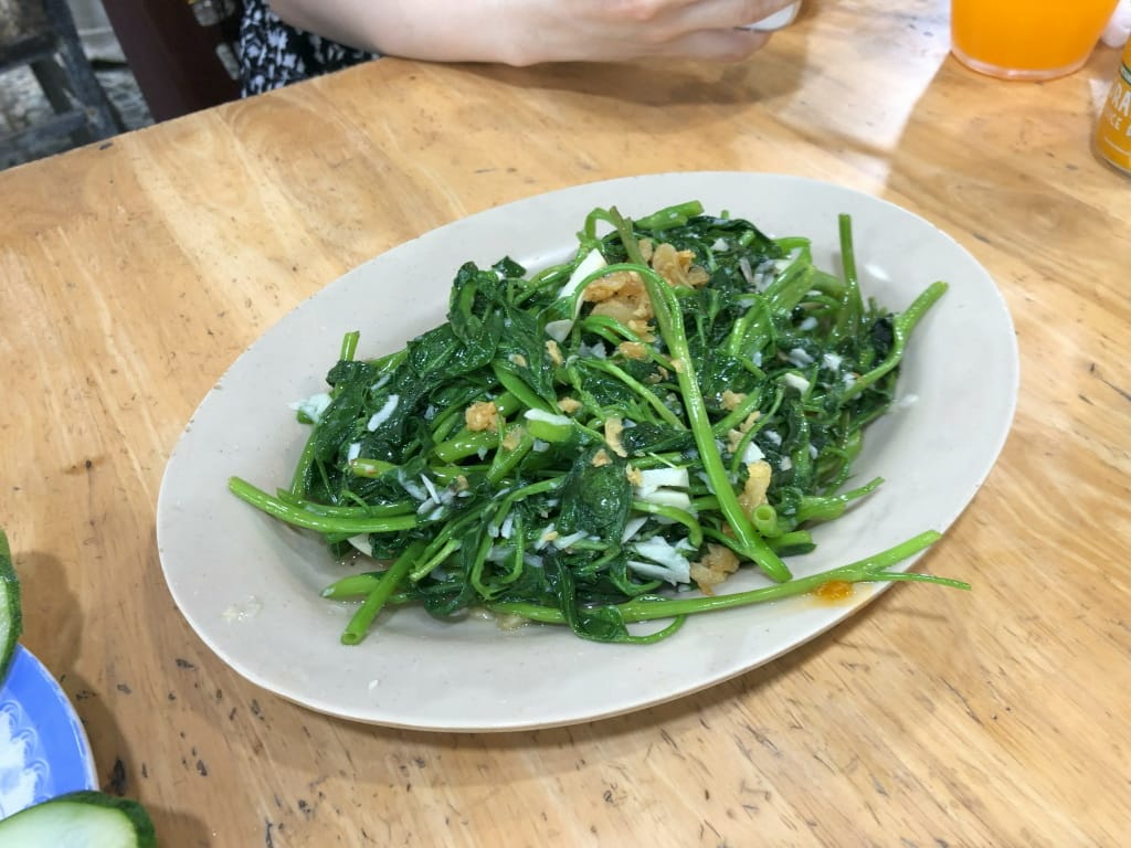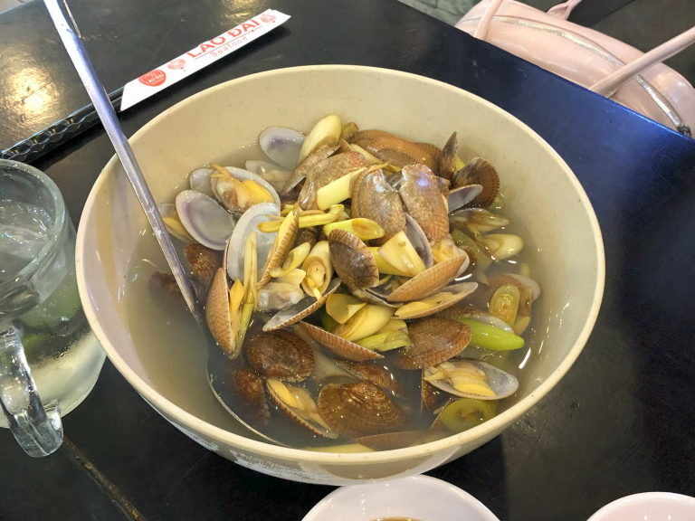 牡蠣のグリルも最高で、かけてあるソースがいいんです。空心菜の炒め物にはマテ貝が結構入っていて味を深めます。アサリのレモングラス蒸しは貝からでたスープもおいしい。ついつい飲んでしまいました。つまるところ、どれを食べても安くておいしいです、はい