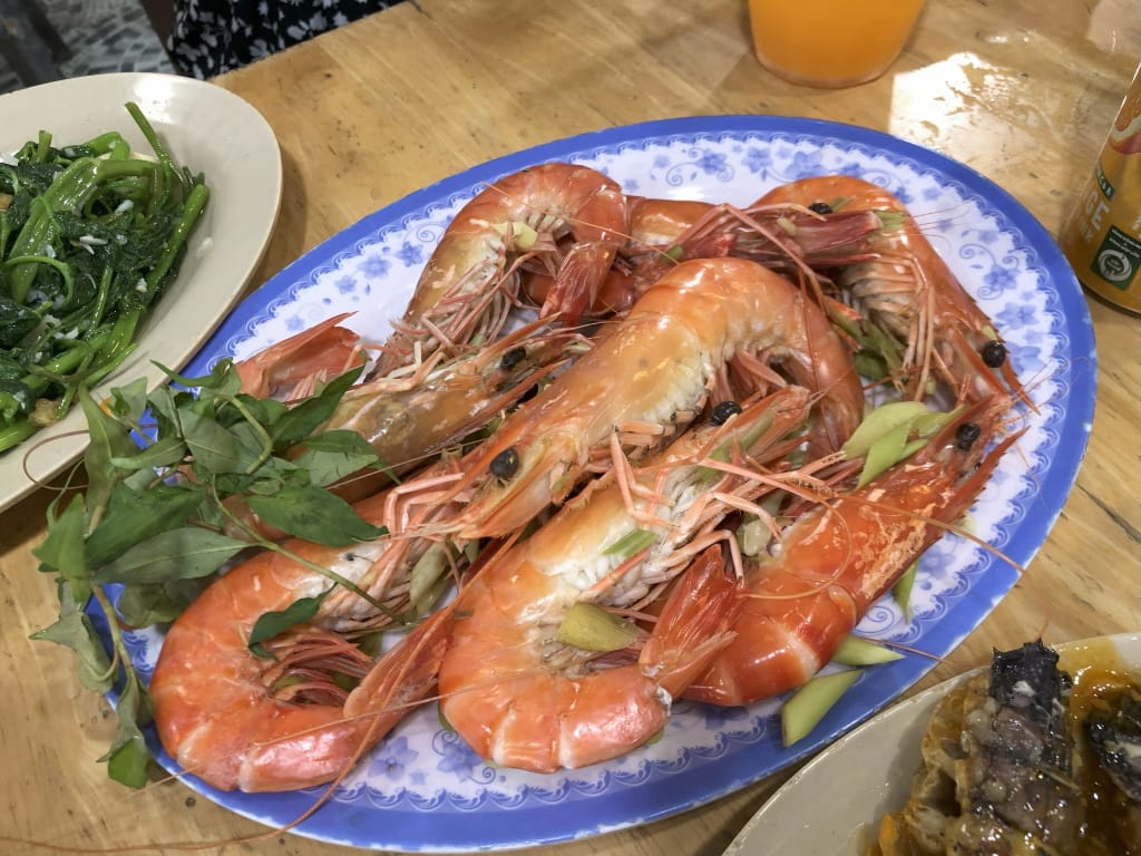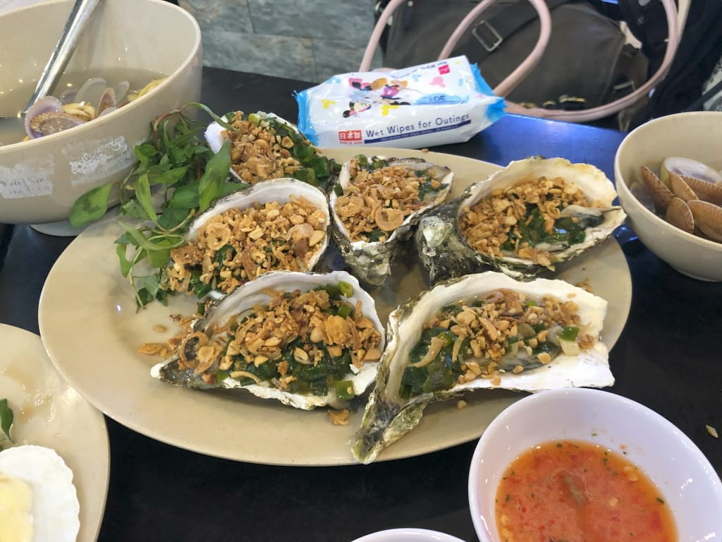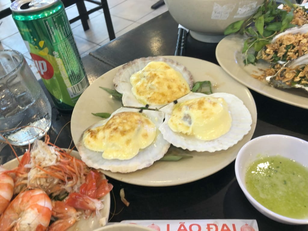 ダナン訪問の際には1回はシーフードレストランに訪れてみては如何でしょうか。特にエビ好きな人には大変おすすめです。サイズが大きくて食べ応えがあって、しかもおいしい。他の料理もおいしくて、貝のグリルのソースは本当においしい。カニやイセエビを頼まなければ相当にコスパ高いです。日本では恐らく3倍の費用が必要になると思います。なお、シーフードには当たるリスクはありますが、自分たちは無事でした