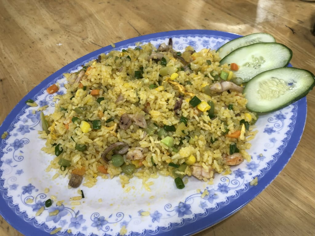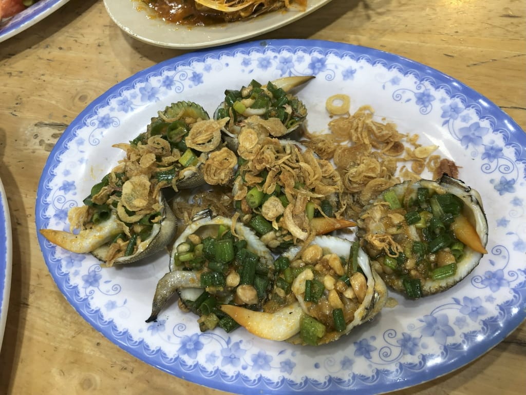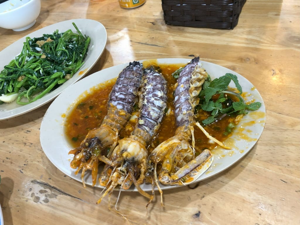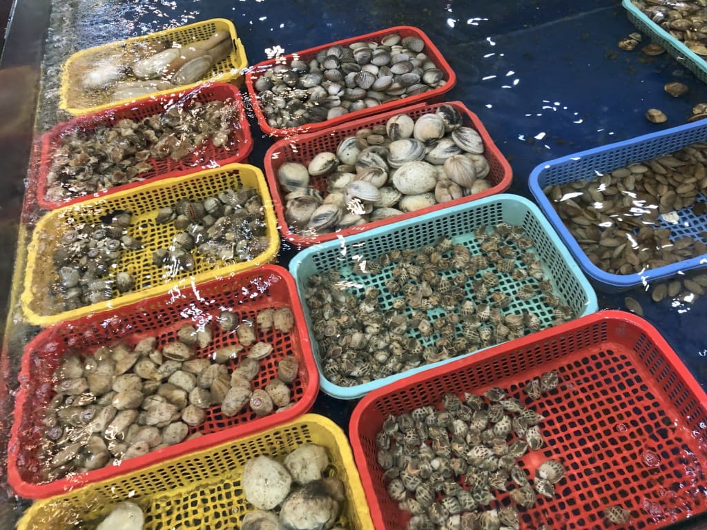 ドラゴンブリッジ近くのシーフードレストランです。水槽から食材を選んで、調理方法を選んで料理にして出してくれます。最初はテーブルでメニューから選ぶように言われたのですが、水槽から選びたいと申し出て了承。食材と量をお伝えした後、調理方法はGoogle Mapのレビューで投稿された写真を見せたりしながらオーダーOK。エビやホタテは大きい。ホタテの大きいのは単価が高いので3枚だけ