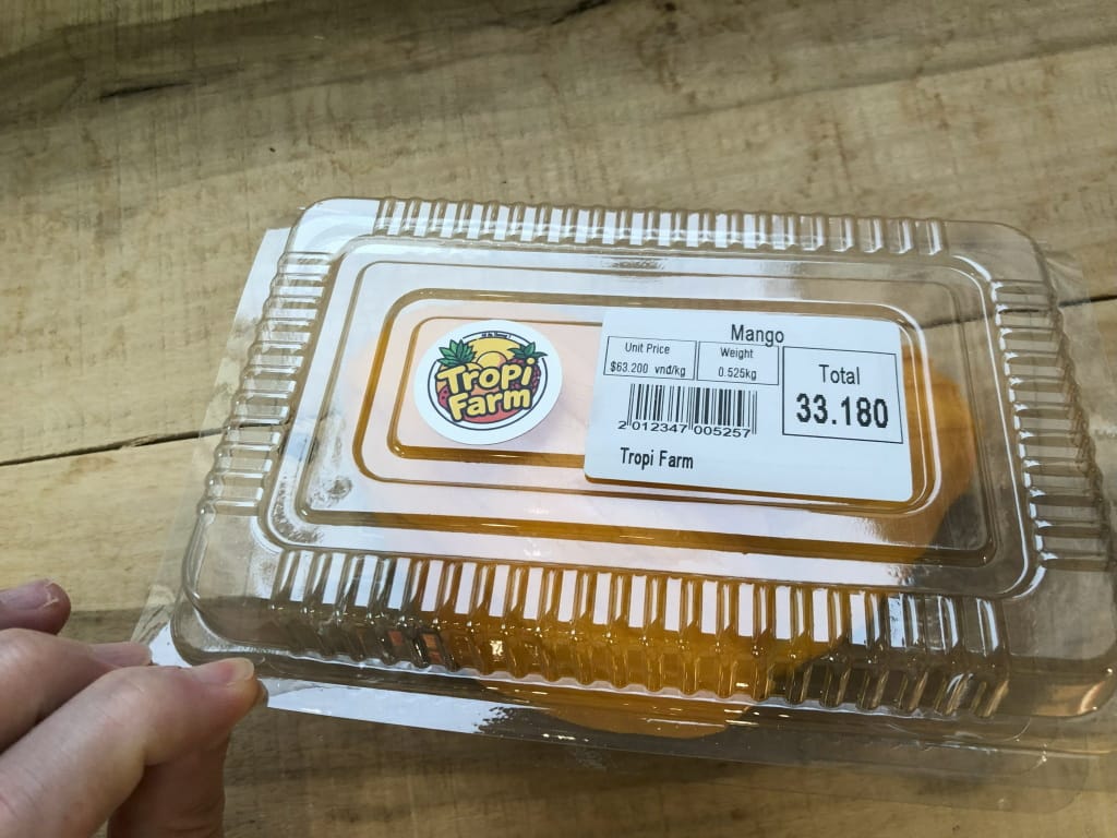 一番よかったのは「Tropi Farm(Google Map)」です。マンゴー単価は63.2Kドン(379円)/Kg。熟し方が良く、大きいものから小さいものまであります。自分で選んでカウンターに渡してスライスをお願いします。こちらはクレジットカード利用可能です。2回行きましたが、最初から行けばよかったと思いました。帰国して思い出しながらブログ書いてますけども、ここのスライスマンゴーをもう一度食べたくなりました。ここのマンゴースムージー(冷凍マンゴーを使うのでフレッシュマンゴーを選ぶ必要なし)は濃厚で、上にマンゴーの角切りが乗っていて贅沢感満載(写真撮り忘れ)。ただし、甘さはスライスマンゴーの方があるような気がします。マンゴースムージーは確か45Kドン(270円)