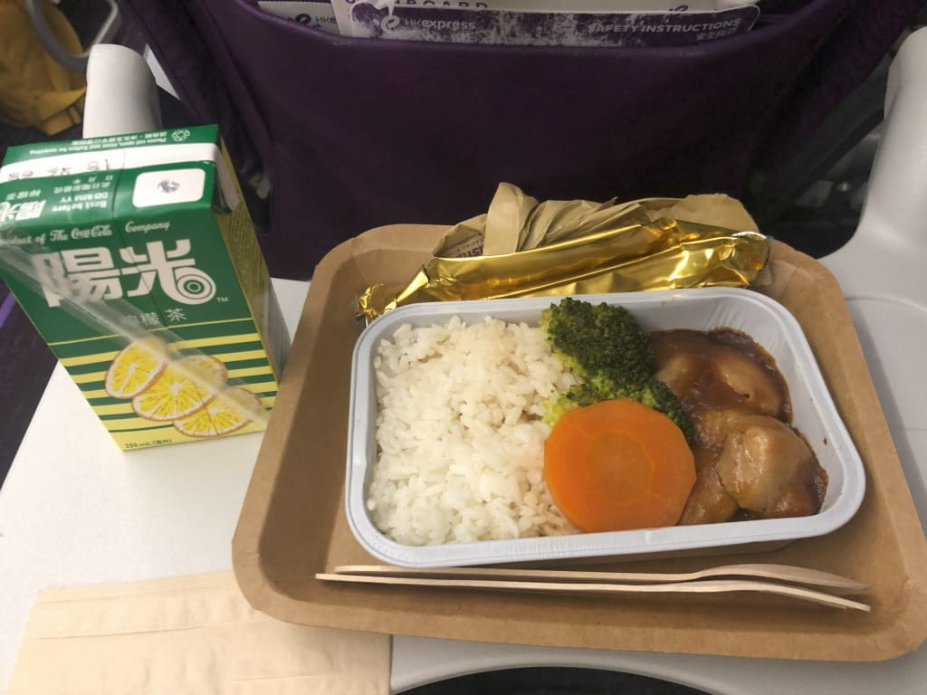 搭乗時間になったので乗り込んで機内で出発を待っていると「食べ物と飲み物が無料」と言われて、「へ?」と思っていたらシートベルトサインが切れた後に、機内食みたいな感じで持ってきてもらいました。満席だったと思いますが、他の人には食事が運ばれていなかったので、殆どの人は普通に香港エクスプレスから航空チケットを買われた人たちと思われます