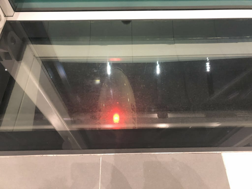 到着ターミナルからバスに乗って第1ターミナルに移動します。制限エリア内でのバス移動は初めての経験でした。確かバスを降りてからだと思いますが、搭乗ゲートに向かう通路の途中に顔とパスポートをスキャンする関所があります。そこを通過すると搭乗ゲートフロアに到着です