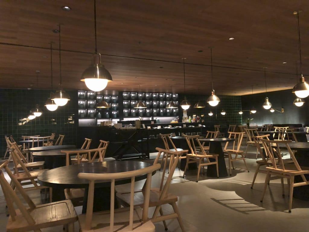 出国後、JALのサクララウンジに直行。カウンターで航空チケットを見せてラウンジに入る。早速会談で2階のダイニングフロアに行くも人が多くて席の確保に手間取る