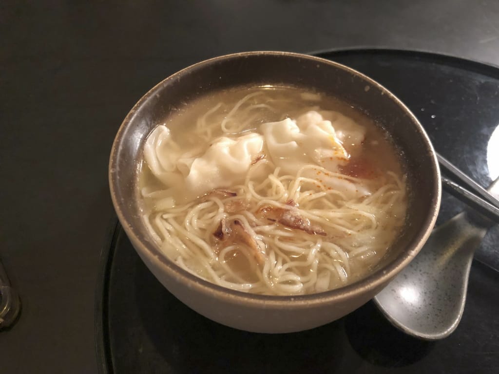 料理の殆どが給仕、時たまビュッフェ形式。ラーメンカウンターでは6:00から開始すると置いてある。麺と焼売・蒸し餃子を提供します。今回はワンタンメンをお願いしました。呼び出しバイブレーションを手渡されます